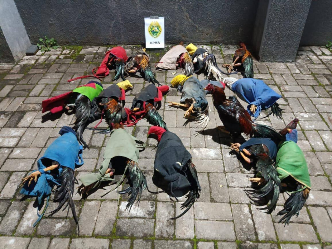 Com o apoio de uma equipe do Pelotão de Choque, as equipes localizaram a propriedade e conseguiram abordar oito homens que tentaram fugir pela mata. No local, foram apreendidos 16 galos utilizados na prática de rinhas, além de materiais como biqueiras de metal, esporas e diversos medicamentos de uso veterinário. Diante dos fatos, todos os envolvidos foram presos em flagrante pelo crime de maus tratos a animais e encaminhados à Delegacia de Polícia Civil para os procedimentos cabíveis.