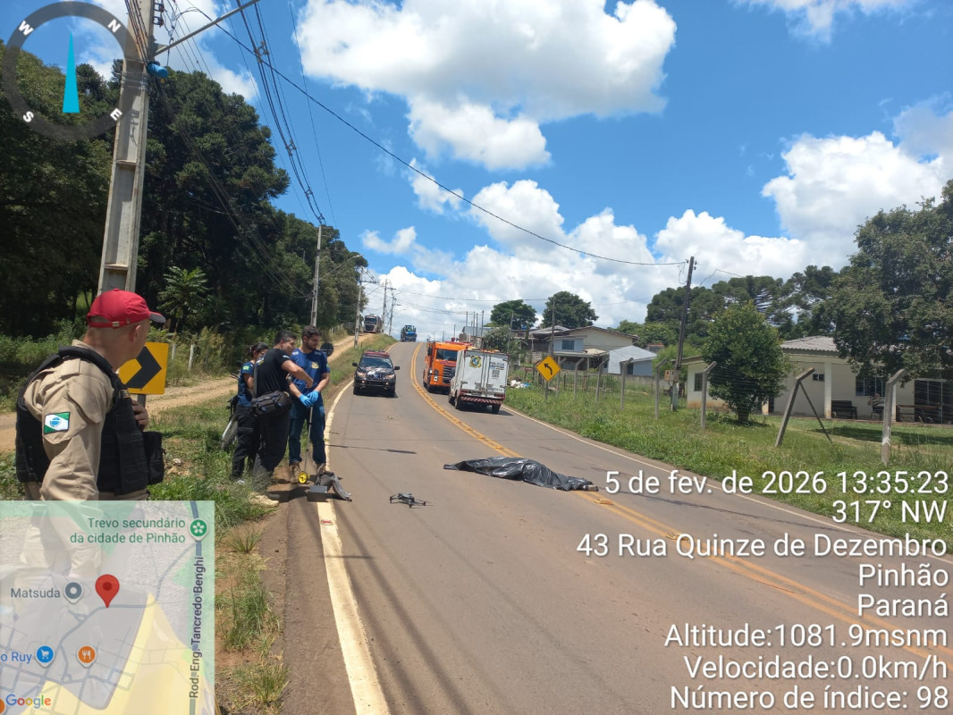 Um grave acidente com vítima fatal foi registrado na manhã desta quinta-feira, 05 de fevereiro de 2026, por volta das 10h30, na rodovia estadual PR-459, km 0 + 600 metros, no município de Pinhão, região central do Paraná.